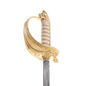 The current M.O.D regulation Royal Naval officers sword features a hand sculpted 24 karat gold-plated lions head pommel, 24 karat gold-plated basket (bearing the Naval insignia) and a traditionally dyed and age dried ray skin hilt. The scabbard is hand made of black buffalo rawhide and fitted with three 24 karat gold plated mounts.
