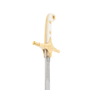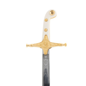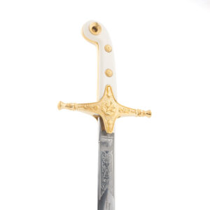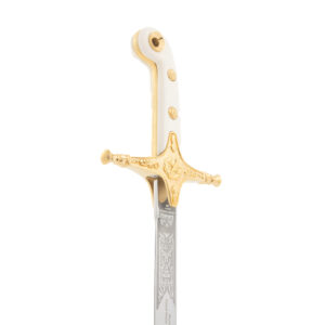 The Senior Iraq Officers Scimitar has a finely etched and distinctively curved single-edged blade which is double-edged for the last 12 inches of its length. This is a Mameluke sword with a crossed hilt made of ivory, featuring gold plated ornamental mounts. The brass guard of the sword is also gilded.