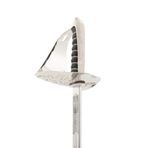 Last revised in 1897 the straight high carbon steel blade is finely etched with the regimental crest. Its three-quarter basket-hilt is defined by the black ray-skin bound grip and silver-plated with copper wire.
