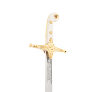 Royal Oman Ceremonial Royal Guard Sword Royal has a finely etched and distinctively curved single-edged blade which is double-edged for the last 12 inches of its length. This is a Mameluke sword with a crossed hilt made of ivory, featuring gold plated ornamental mounts. The brass guard of the sword is also gilded.