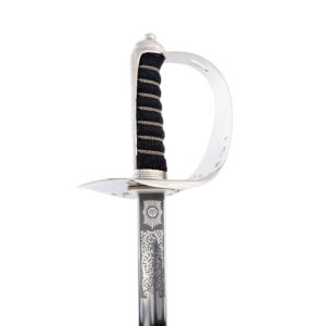 The Infantry Officer’s Sword can be carried in a brown leather scabbard with a plated steel mouthpiece for service wear or in a nickel-plated steel scabbard for full dress occasions.