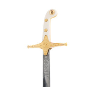 The United Arab Emirates Royal Naval Honour Sword has a finely etched and distinctively curved single-edged blade which is double-edged for the last 12 inches of its length. This is a Mameluke sword with a crossed hilt made of ivory, featuring gold plated ornamental mounts. The brass guard of the sword is also gilded.